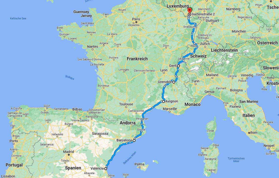 Valencia Barcelona Avignon Genf Basel Spiesen - 17 h 40 min (1662 km)